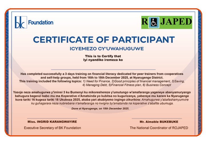 Professionally designed certificates created for BK Foundation in partnership with ROJAPED, supporting skills training programs for people with disabilities through clear, inclusive, and impactful design.
